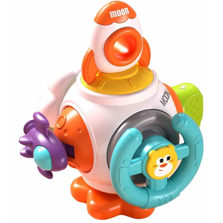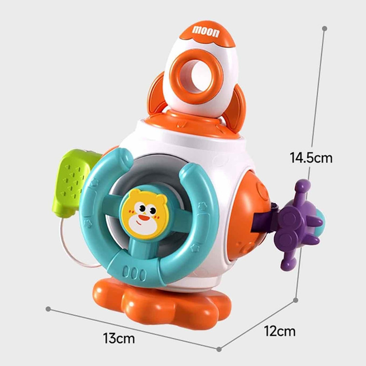 یک سفینه فضاپیما با ترکیب رنگ سفید و نارنجی در سمت دیگر محصول قرار دارد. مرکز این سفینه سوراخ است. اگر کودک انگشت خود را از سوراخ سفینه عبور دهد و آن را رو به بیرون حرکت دهد، به واسطه نخی که وجود دارد، سفینه فضاپیما کمی حرکت می کند.
