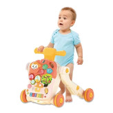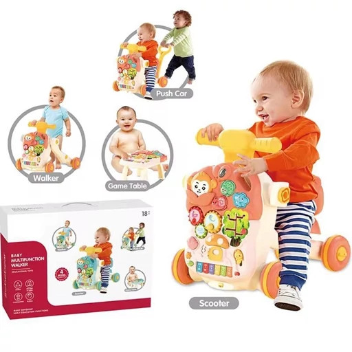 چهار کاربرد در یک محصول: این واکر بهطور هوشمندانه برای چهار مرحله از زندگی کودک طراحی شده است: میز بازی (از 6 ماهگی): سینی واکر جدا شده و با اتصال پایهها به یک میز بازی جذاب تبدیل میشود. پیانوی موزیکال و پازلهای روی آن، کودک را ساعتها سرگرم میکنند. واکر آموزشی (از یک سالگی): با برداشتن سینی و تبدیل آن به واکر، کودک در اولین قدمهای خود یاری میشود. دسته قابل تنظیم ارتفاع، این واکر را برای قد کودک شما مناسب میکند. اسکوتر: با کمی تغییر در ساختار، واکر به یک اسکوتر جذاب تبدیل میشود. واکر چهارچرخ (واکر هل دادنی): در این حالت، یک دسته به پشت واکر متصل میشود تا کودک بتواند آن را هل دهد و مهارتهای حرکتی خود را تقویت کند. تقویت مهارتهای کلیدی: بازی با این واکر، مهارتهای ارتباطی، توانایی حل پازل، راه رفتن، قوای بصری و شنیداری و رشد ذهنی کودک را تقویت میکند. موزیکال: پیانوی کوچک روی میز، موزیکهای جذاب و ملودیهای شنیدنی پخش میکند که با سه باتری قلمی کار میکند. ابعاد مناسب: ابعاد واکر 46×44×48 سانتیمتر است.