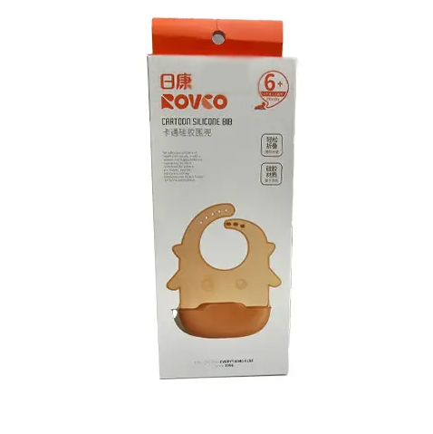 پیش بند سیلیکونی رووکو دارای گیره دور گردن جهت تنظیم سایز دارای محفظه کاسه ای فاقد مواد مضر و BPA مناسب 6 ماه به بالا